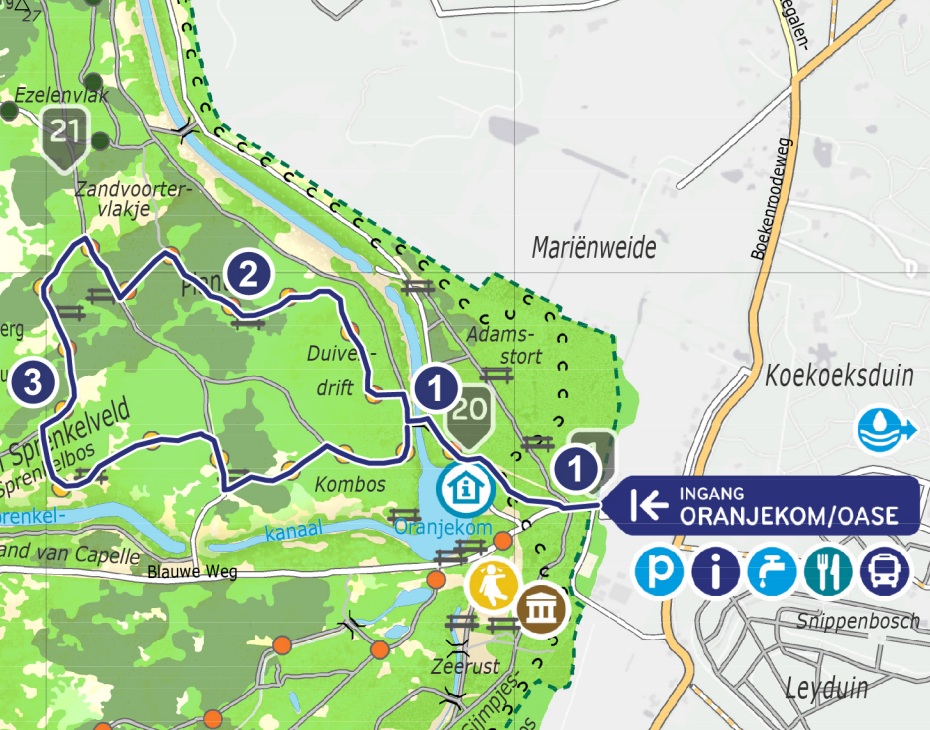 U volgt de gekleurde gele paaltjes vanaf ingang Oranjekom/Oase. Deze korte, mooie route van 3,7 km loopt over een smalle brug tussen de Oranjekom en het Noordoosterkanaal door een gevarieerd, glooiend terrein. Naald- en loofbos wisselen elkaar af. Bij het Museumduin gaat het pad door de Duivendrift naar de uitgang. Hoogtepunten zijn het Museumduin, dat zijn naam dankt aan een bunker waar tijdens de Tweede Wereldoorlog kunstschatten lagen opgeslagen. Verder ziet u tijdens de route nog meer bunkers liggen.