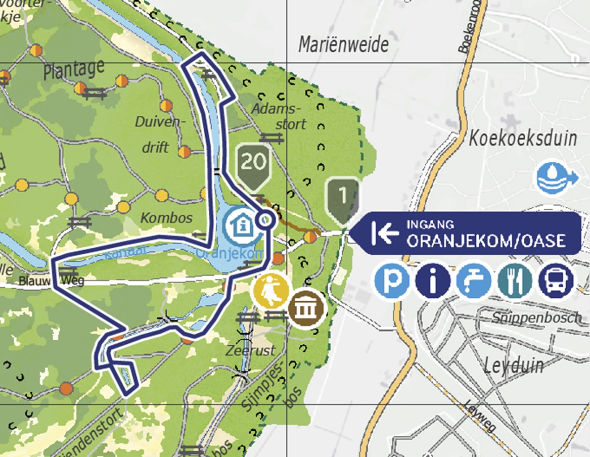 1. Loop vanaf ingang Oranjekom/Oase naar het bezoekerscentrum. Daar start de wandeling.